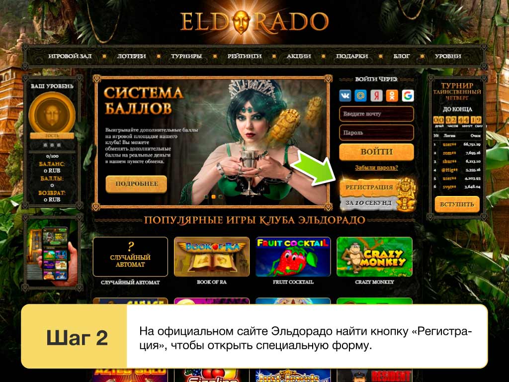 Платные версии игр от сайта Эльдоклуб в 2026 в любом случае станут доступны только после регистрации. Пользователи с аккаунтами в казино смогут привязать к ним свои счета и делать депозиты. В противном случае, придется довольствоваться только демо версиями. Чтобы зарегистрироваться достаточно сделать следующее: