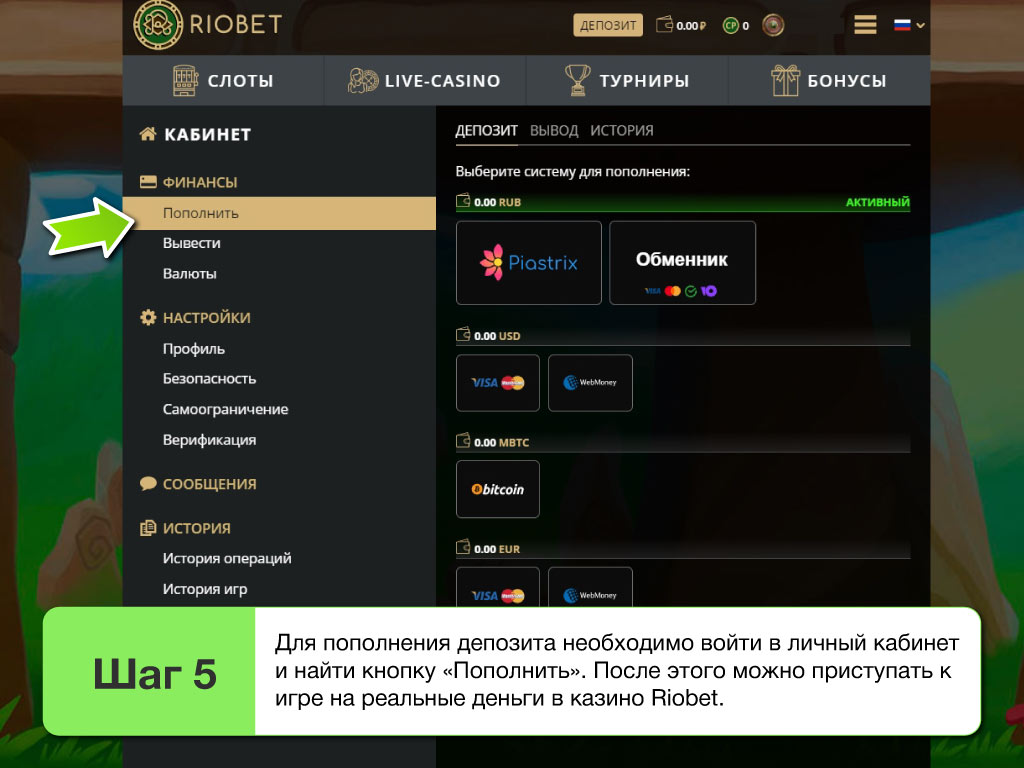 Пополнить счет в казино Риобет можно через личный кабинет. Там есть раздел для депозитов с формой. Игрок просто заполняет форму, в которой указывает способ пополнения, сумму и заполняет поля по платежным реквизитам. Далее форма отправляется и деньги моментально появляются на счету на сайте игрового клуба.