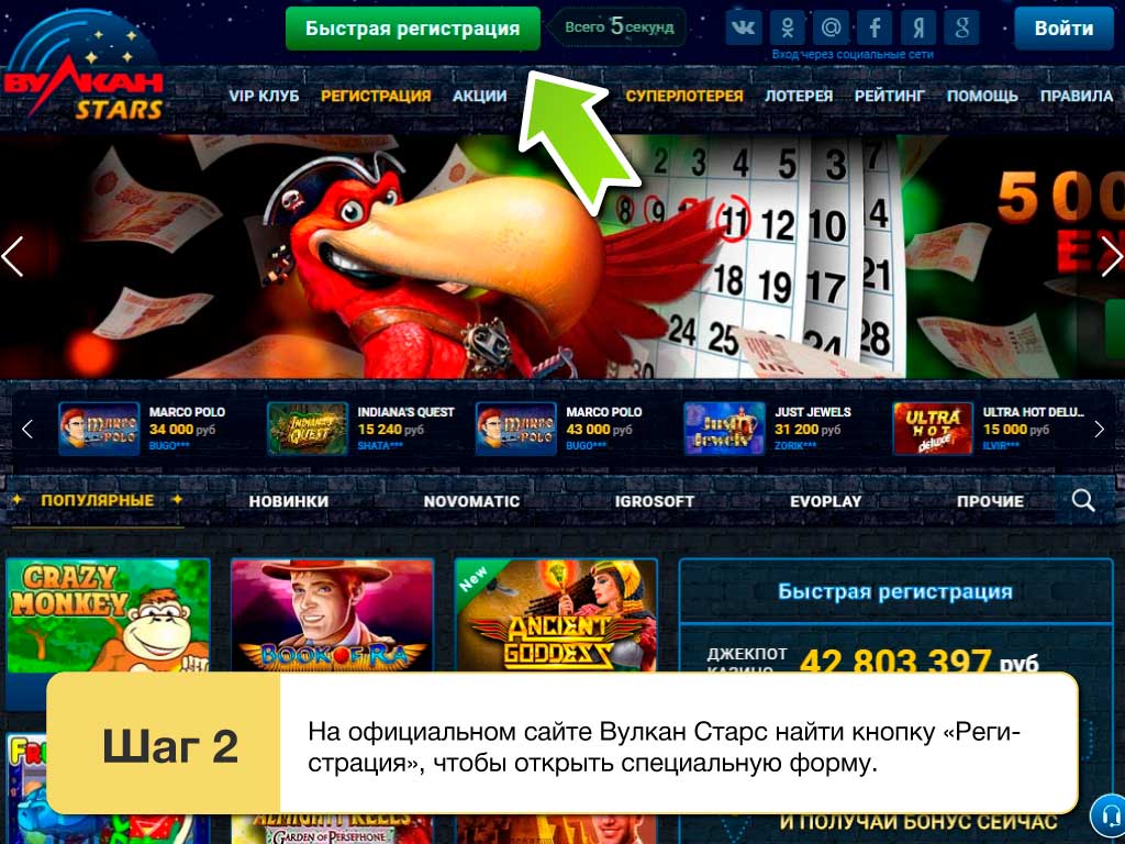 Регистрация в Vulcan Stars и бездепозитный бонус новичкам