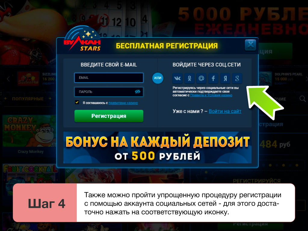 Чтобы получить полноценный доступ к сайту Vulcan Stars, новые пользователи должны выполнить условия регистрации в клубе 2026. Для этого нужно внести персональные данные в анкету, и подтвердить активацию аккаунта через ссылку, полученную в письме, поступившем на е-mail. Игроки могут использовать официальный сайт, а если он не работает — рабочие зеркала, чтобы зарегистрироваться на площадке. Посетителям казино, выполнившим процедуру регистрации, администрация Vulcanstars предоставляет без депозита приятный бездеп бонус на 500 рублей. С его помощью можно сразу начинать игру на реальные деньги.