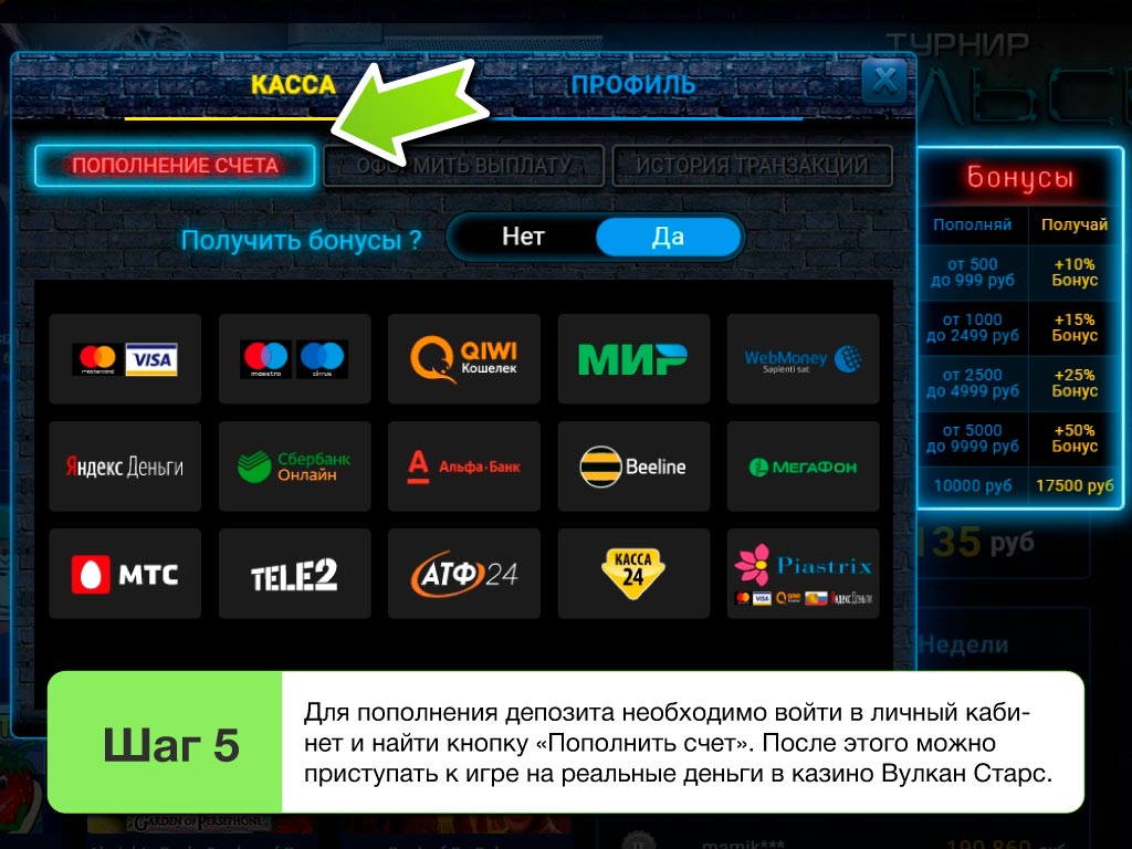 Ввод денег на депозит и вывод выигрышей из Vulkan Stars
